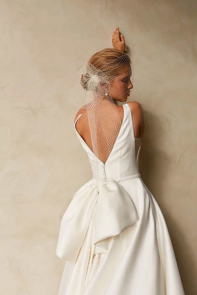 Lucia from the stunning Maya Bella Collection by Tania Olsen Bridal is the epitome of modern elegance. Her clean ballgown silhouette is timeless yet fresh, offering an effortlessly flattering fit for the contemporary bride. Crafted from luxurious textured Mikado, the bodice features a plunging V neckline with sheer mesh inserts at the front and sides, striking the perfect balance between sophistication and allure. At the back, a row of delicate buttons cascades down into a sweeping chapel-length train. For an unforgettable finishing touch, Lucia also offers the option of a dramatic detachable bow detail — allowing you to transform your look from classic to statement in an instant.