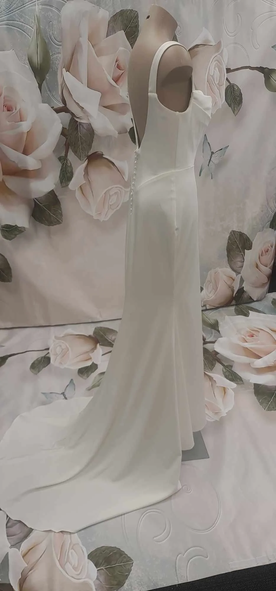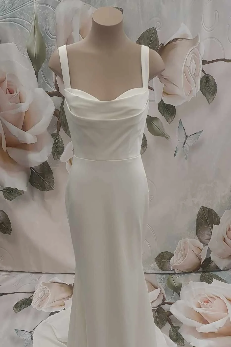 Stunning and luxurious, Peridot exudes that Old Hollywood glamour in a modern and soft luxe look. Sexy wideset straps grace the shoulders before joining the ultra-flattering cowl neckline. The sumptuous liquid crepe fabric clings to the contours of the body and elegantly drapes into an sophisticated column silhouette. In the back, a low open v shape detail meets a row of fabric-covered buttons before falling into a sweeping train, the final, show stopping detail worthy your walk down the aisle.