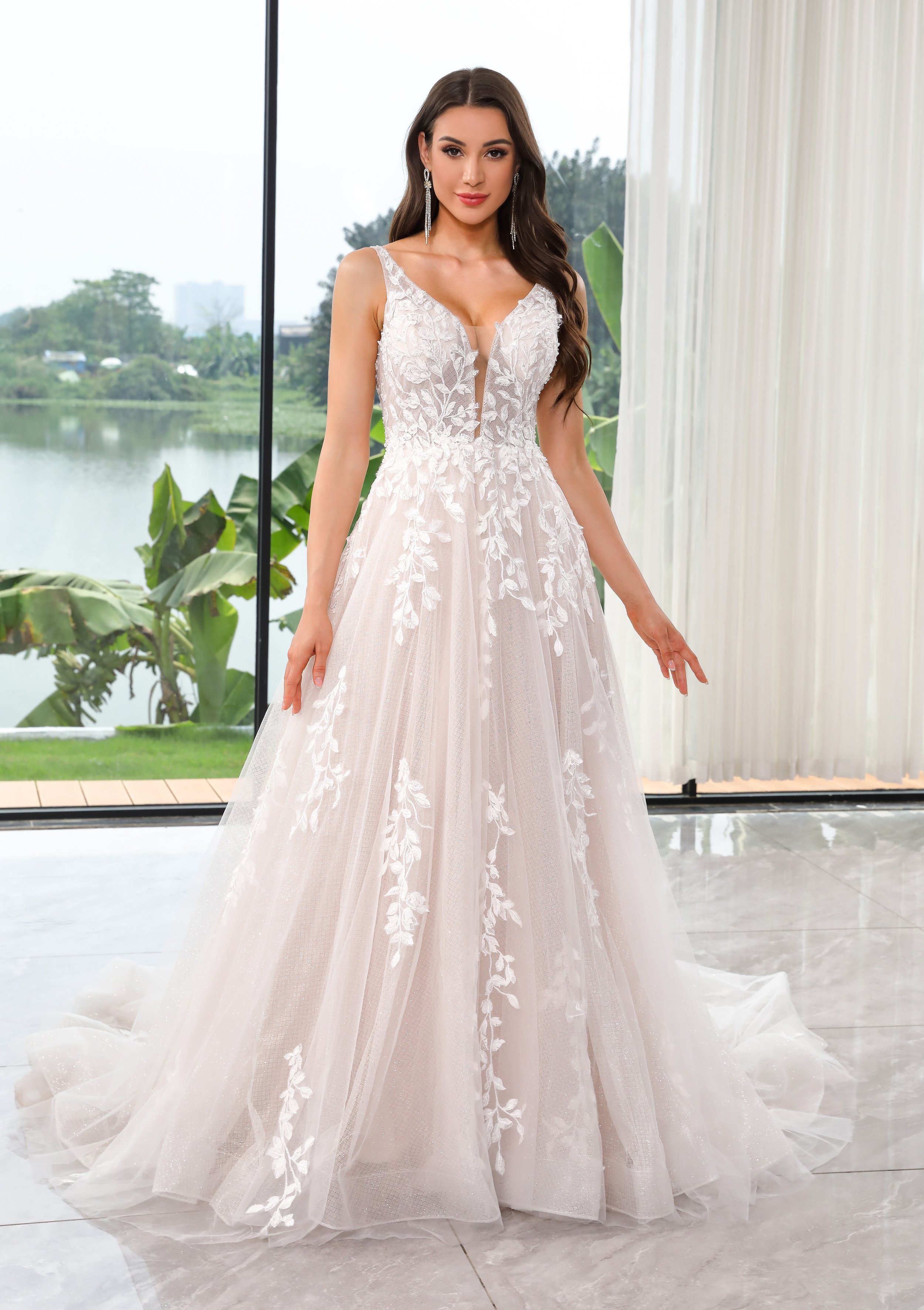 Delicately beaded with bugle beads and seed pearls Caraway has a deep plunge front elongating the bodice down from the shoulder strap. The skirt is crafted from layers of soft tulle with a delicate sparkle underskirt and flows into a chapel train.