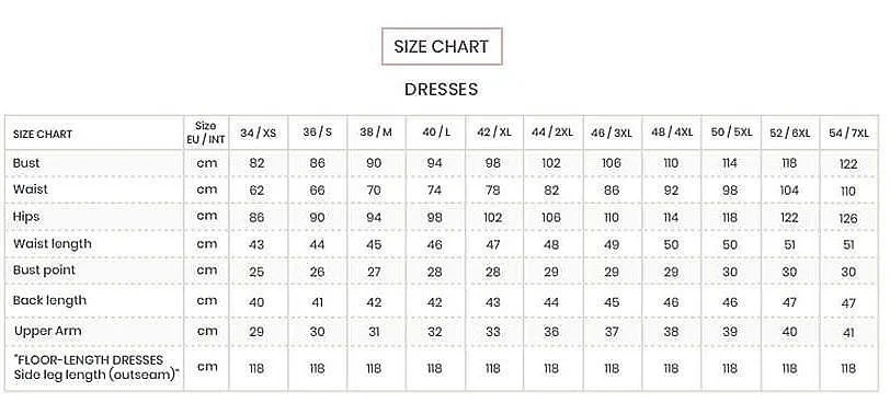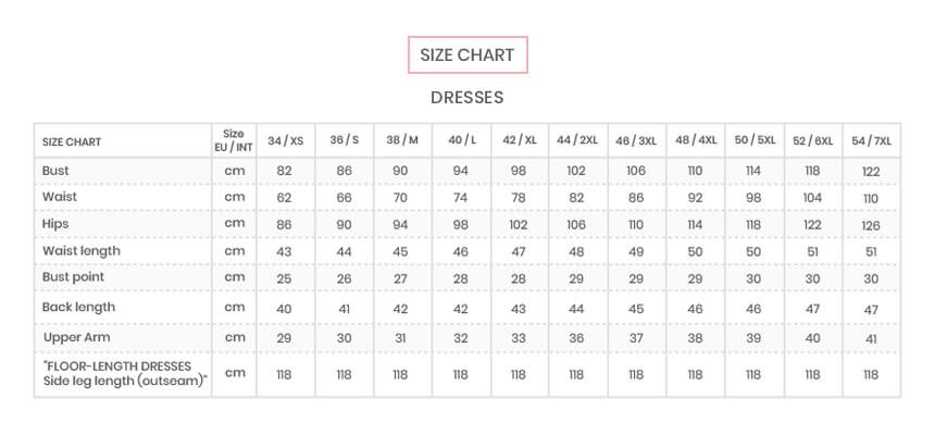 Dress size chart with measurements for bust, waist, hips, waist length, bust point, back length, upper arm, and floor-length dresses in sizes 34/XS to 54/7XL.